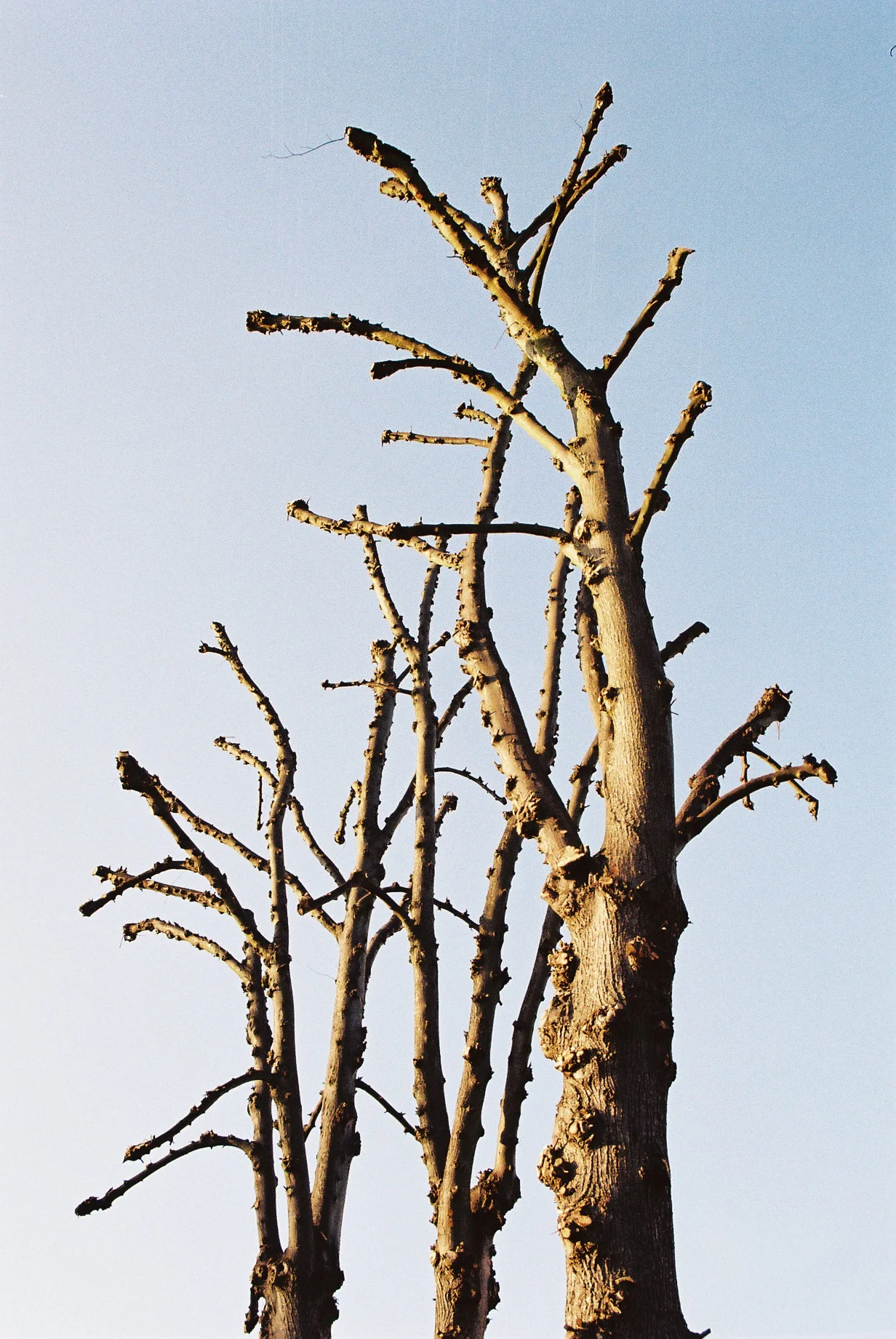 This is my favourite photo of the lot. In spring the trees are cut back so drastically that it is hard to imagine how they will survive this aggressive "surgery". But they always bounce back and in a few weeks their crowns will be as full and green as ever. I love the knobbly, rough surfaces against the smooth, almost flawless sky, and how the bark reflects in the evening light. It's like spindly arms of a octogenarian stretching out to the warm sun of spring.