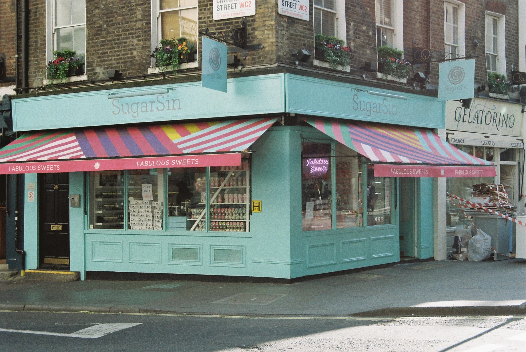 This shop front is definitely NOT as pale and pastel-coloured as this, but an in-yer-face bold turquoise with bright pink blinds. (Covent Garden, opposite Drury Lane Theatre).
