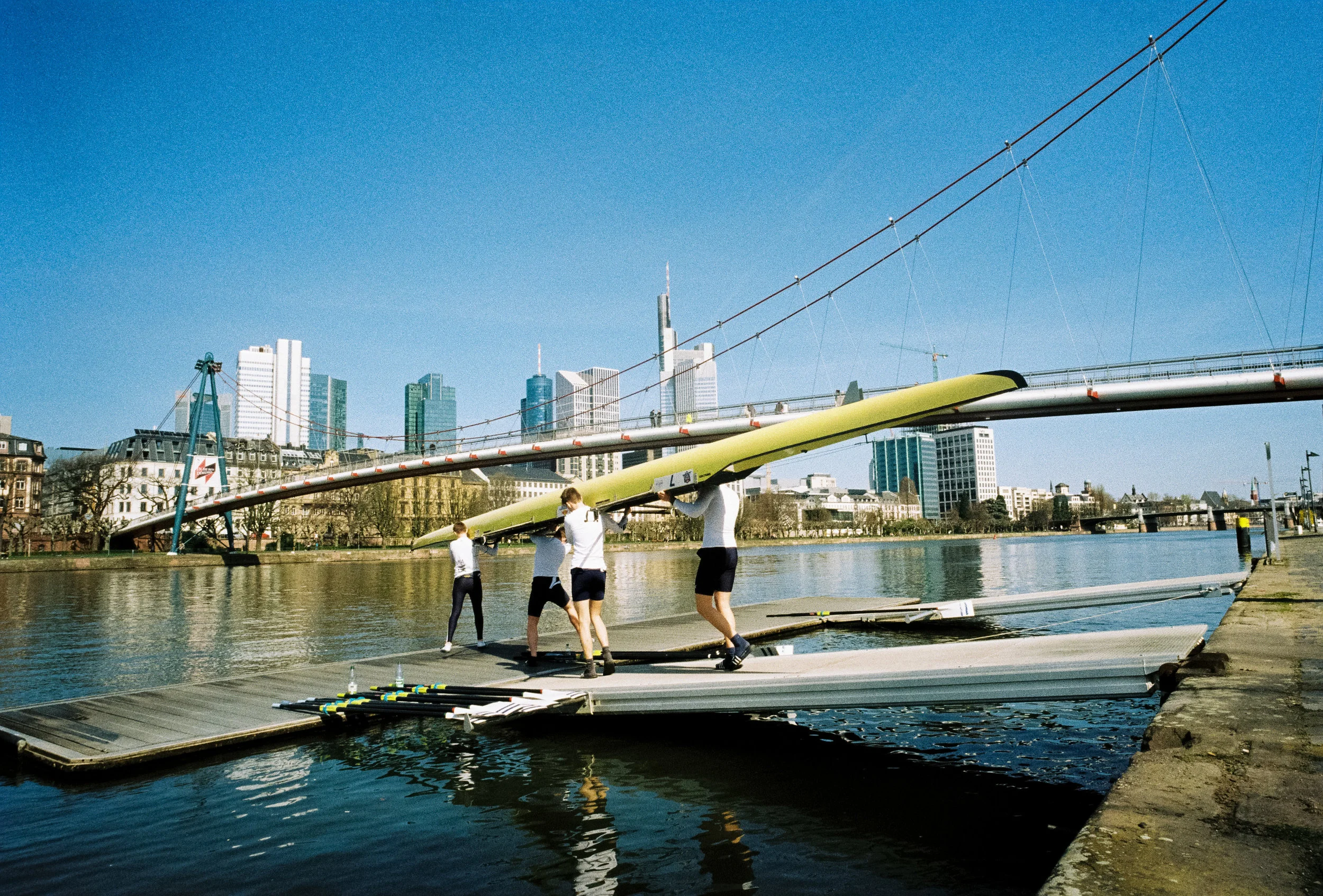 Rowers from the Germania rowing club boating right in the centre of the city. Their boathouse is across the street and they have to walk the boat over a traffic zebra crossing and down a ramp - that could take a while with a big 8! Clearly no one has told them that rowing is a (very early) morning sport, but I was happy to have a good subjet for this shot.