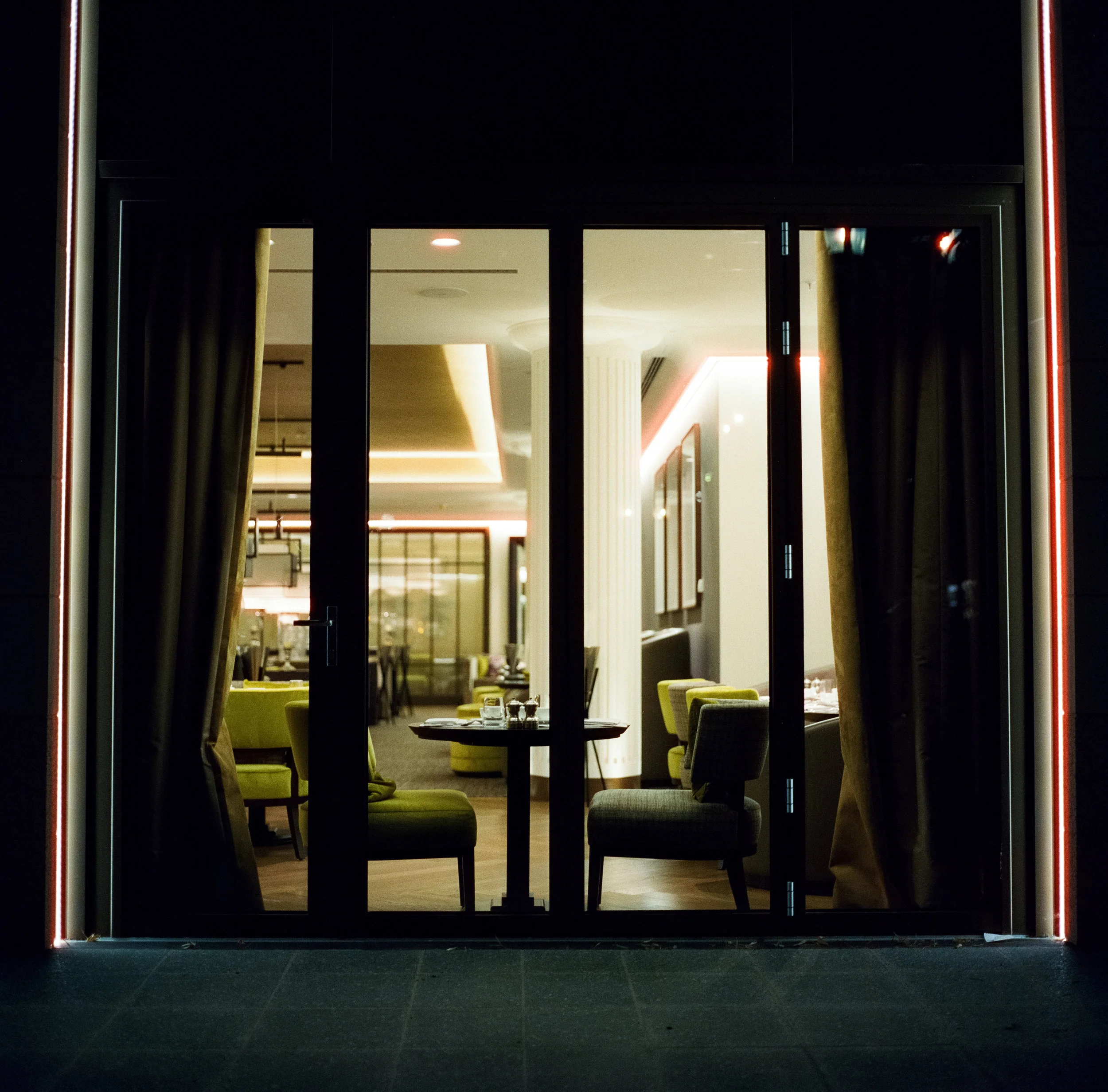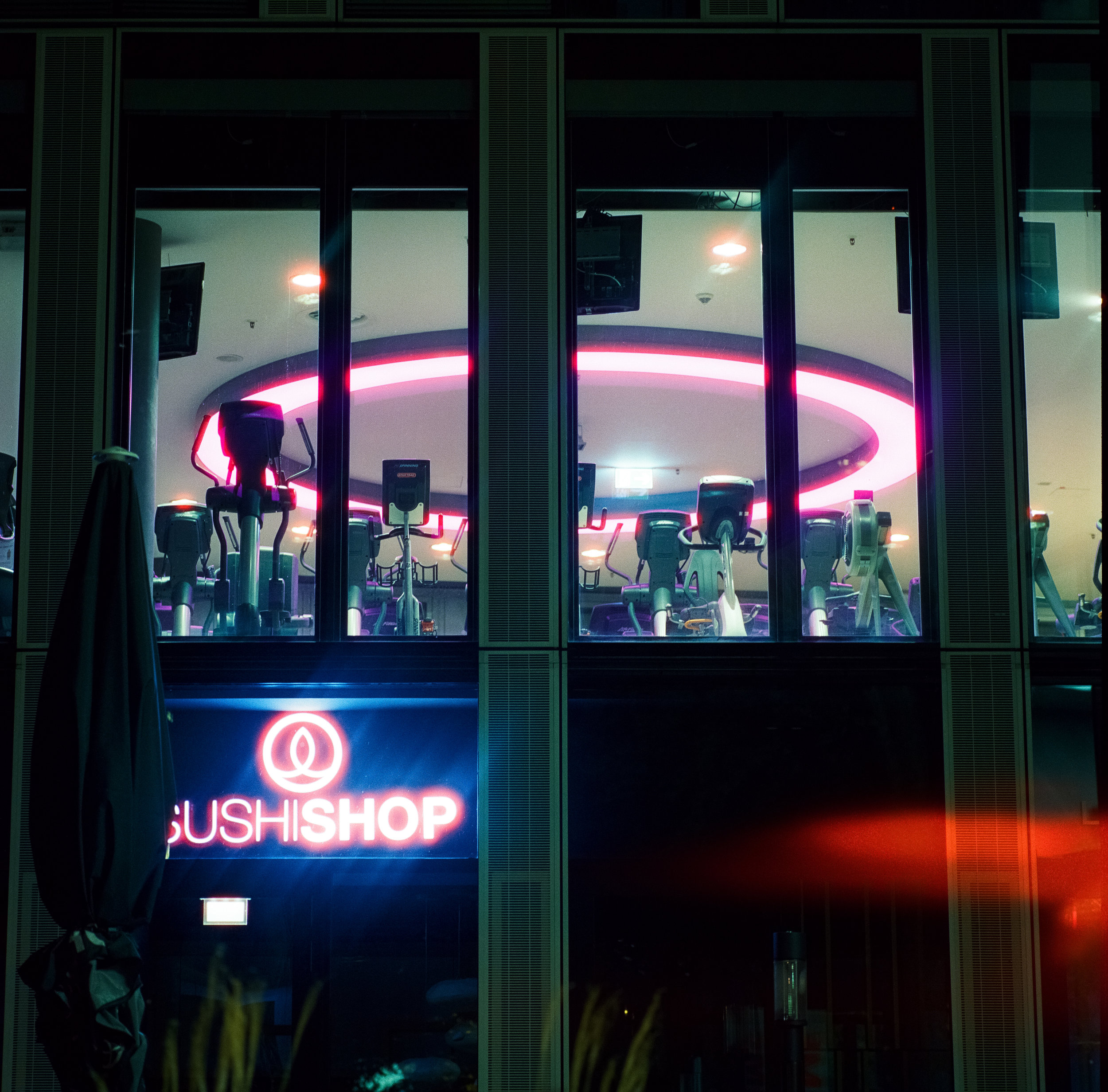 Armed with a few rolls of the wonderful Cinestill 800T (T for Tungsten balanced) film, I went out after hours in search of neon lights and empty spaces.