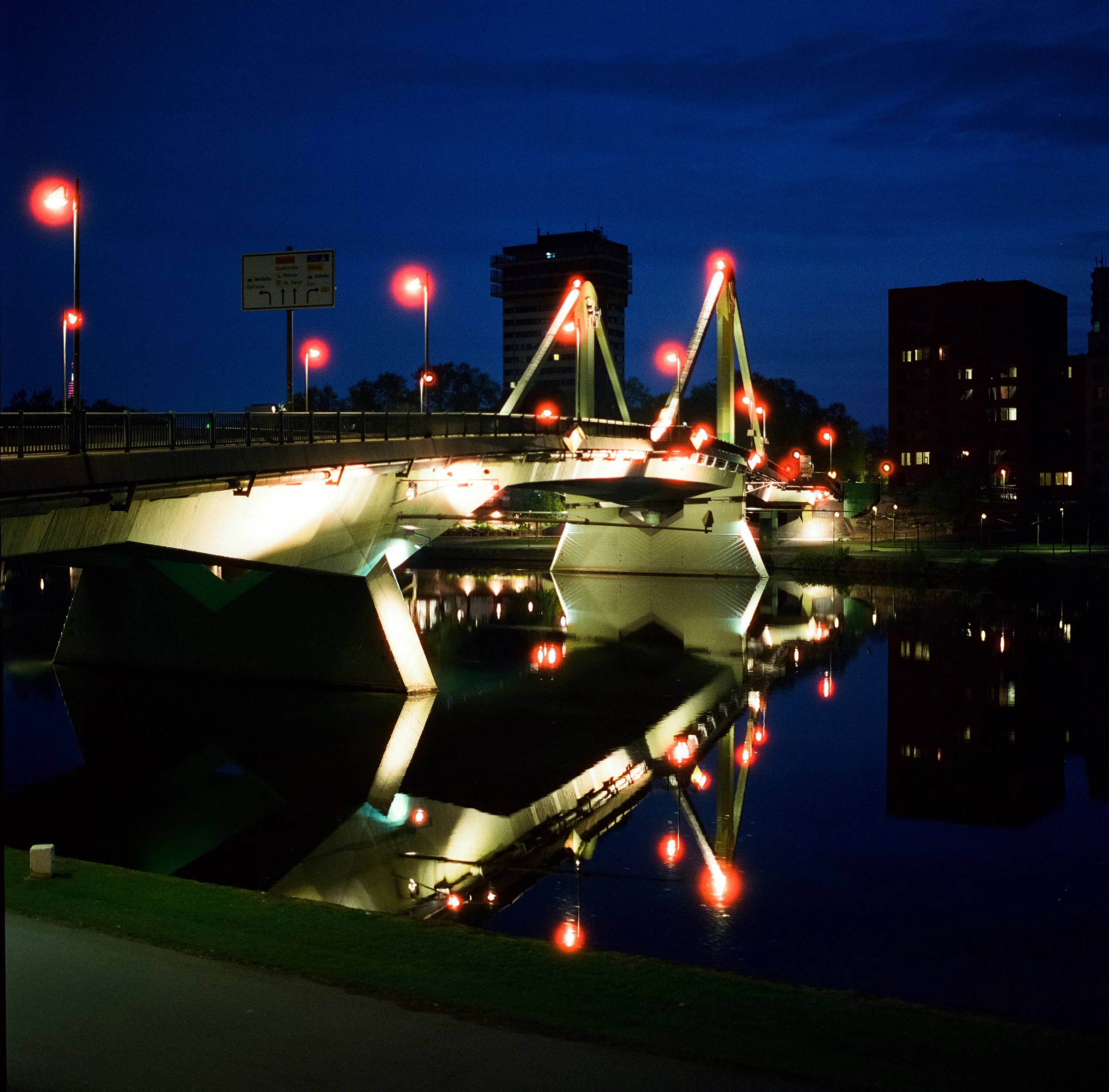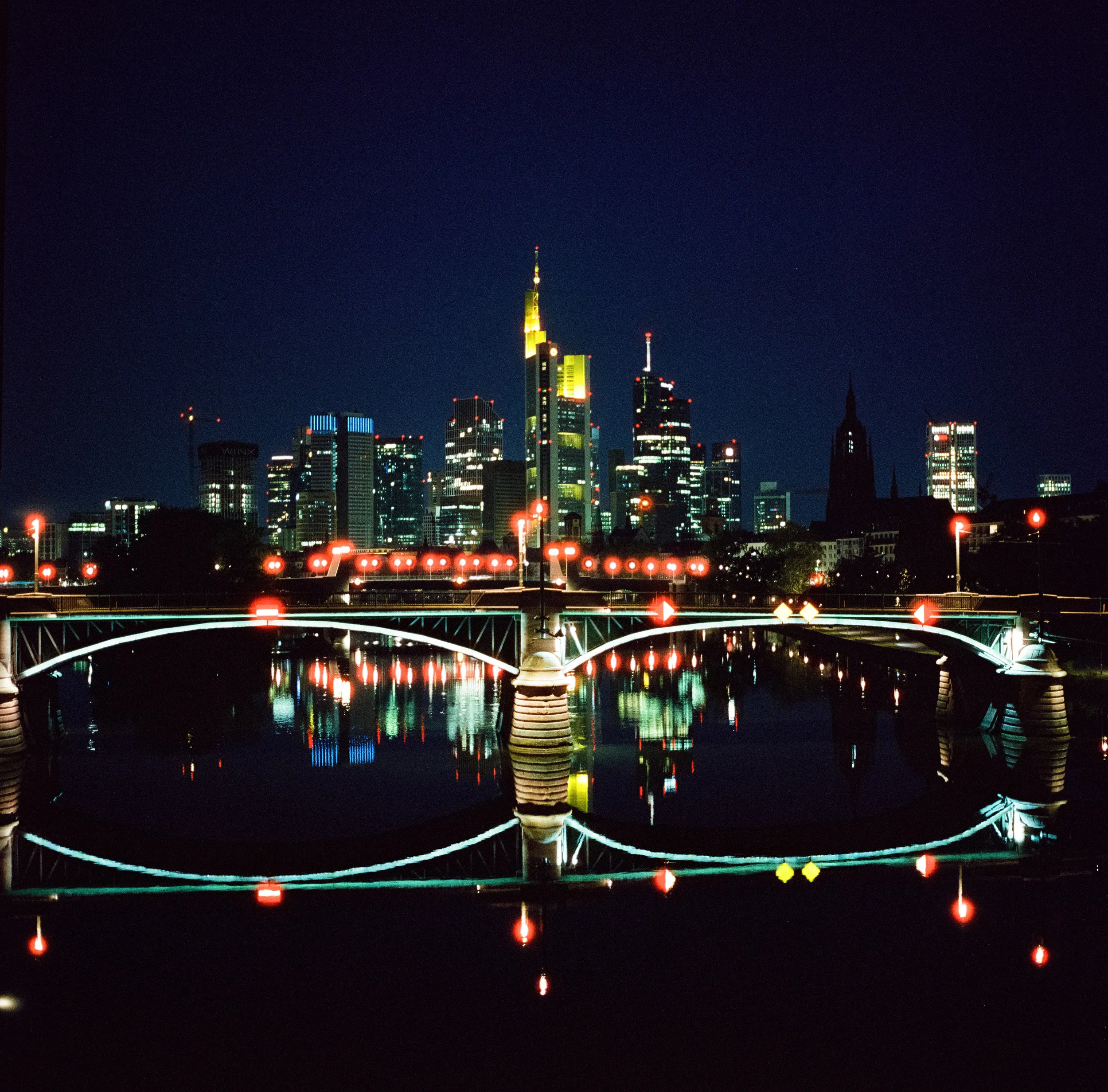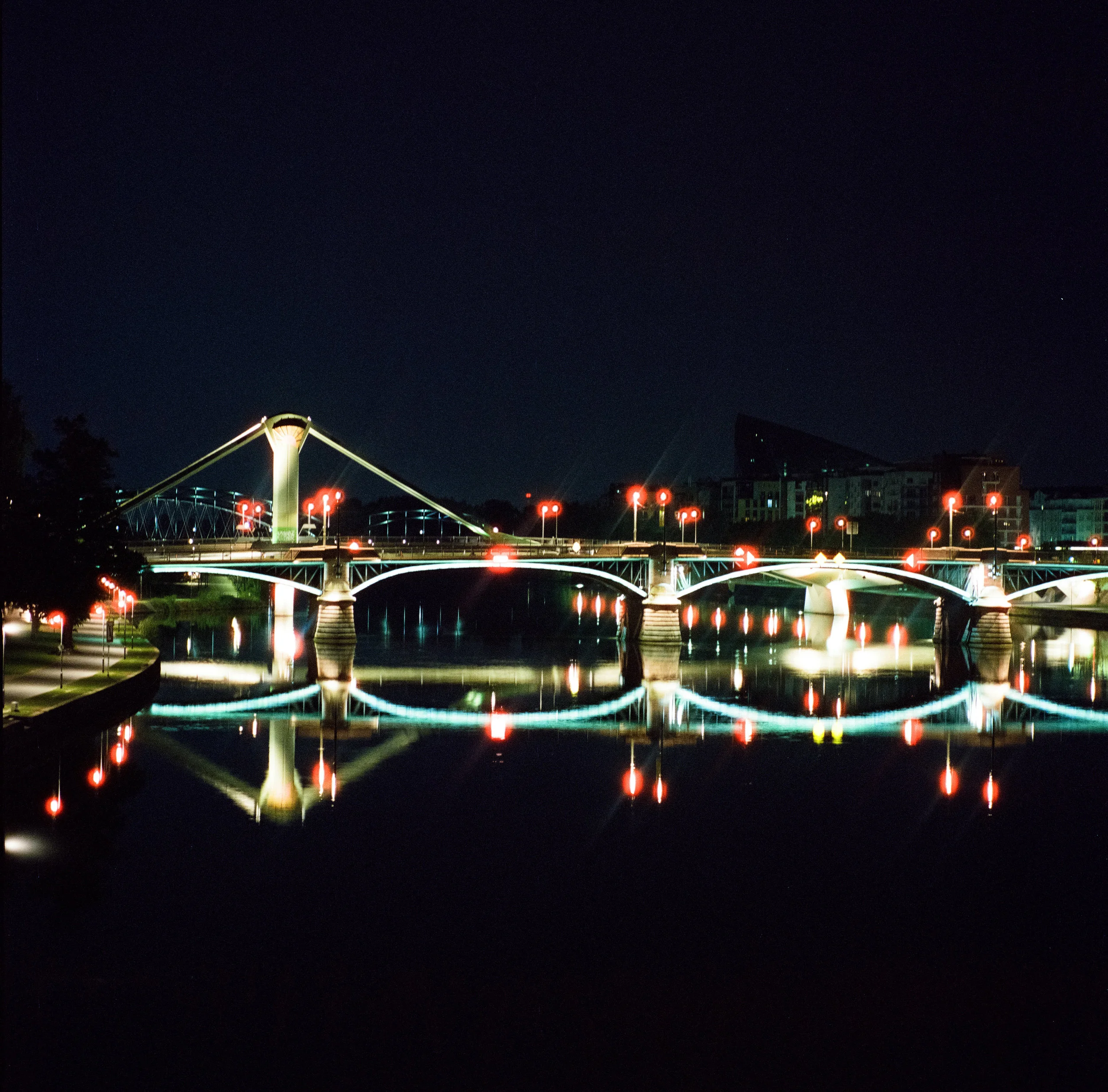 That is the bridge the other Frankfurt skyline photo (above) was shot from. As with all the riverside photographs, the stillness of the water was incredible. I really like how well this film is able to capture the little light available and make it so clear. Again, crazy streetlighting going on!