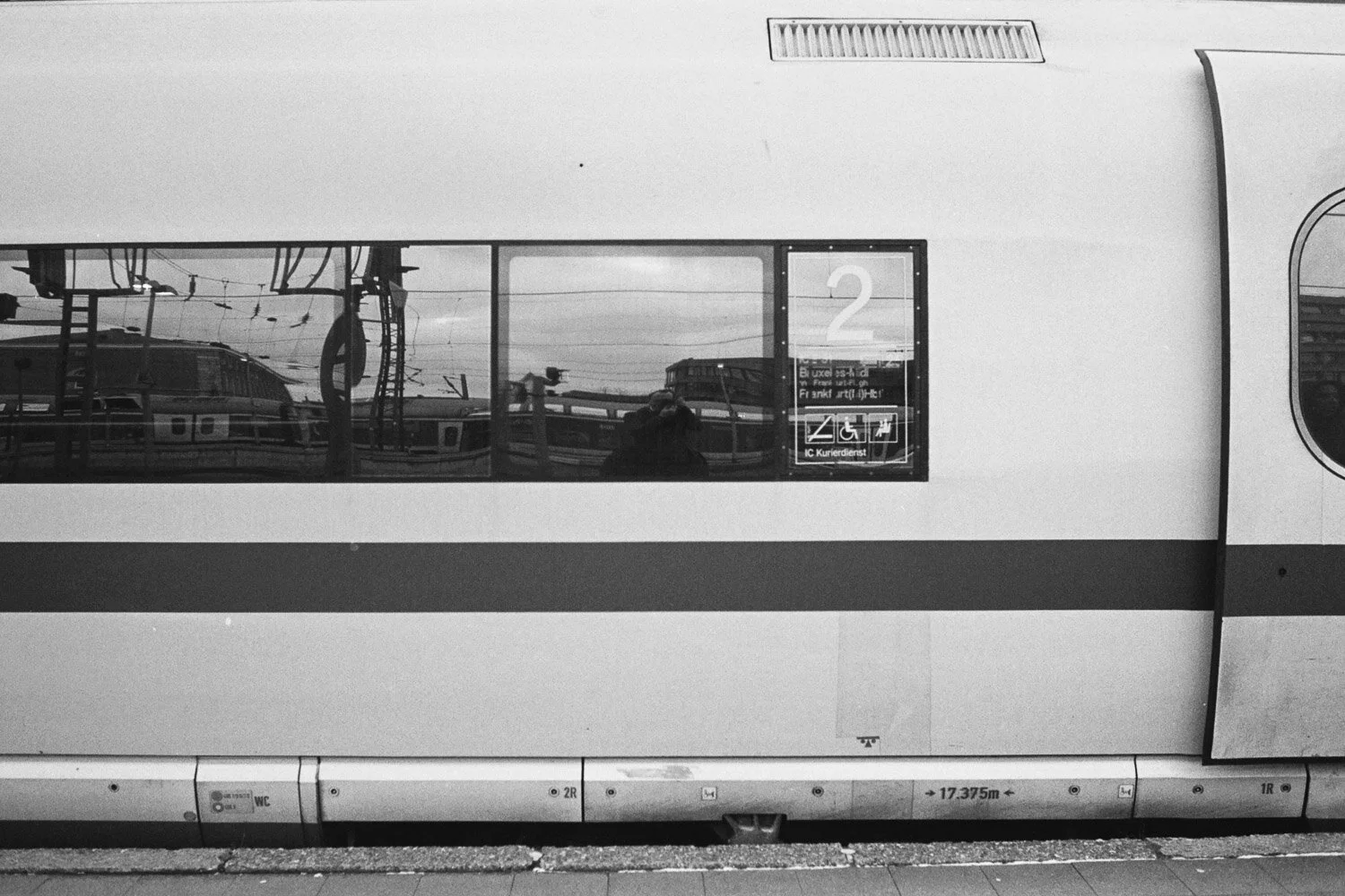 Arrival to Aachen on a German ICE train that follows the Brussels to Frankfurt route. You can just about make me out in the reflection.